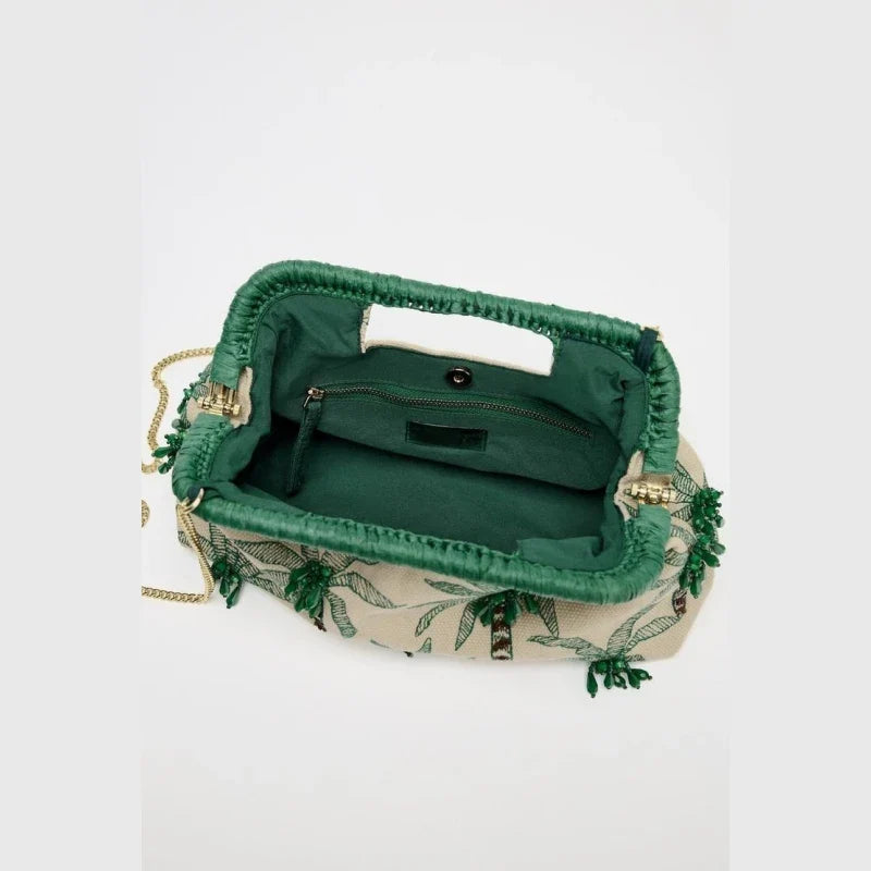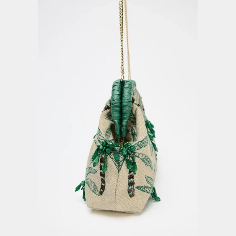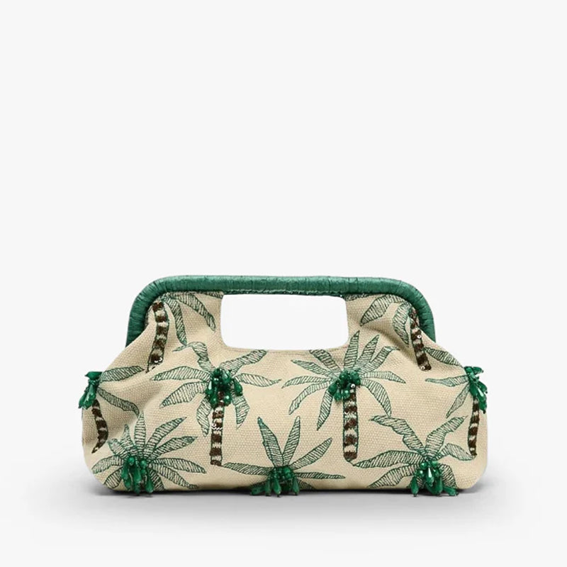 Step into an endless summer with The Penelope, a clutch that’s more than an accessory—it’s a vacation you can hold. Handcrafted in a breezy sand-hued canvas and embroidered with lush green palm trees, every detail feels like a postcard from your dream getaway.